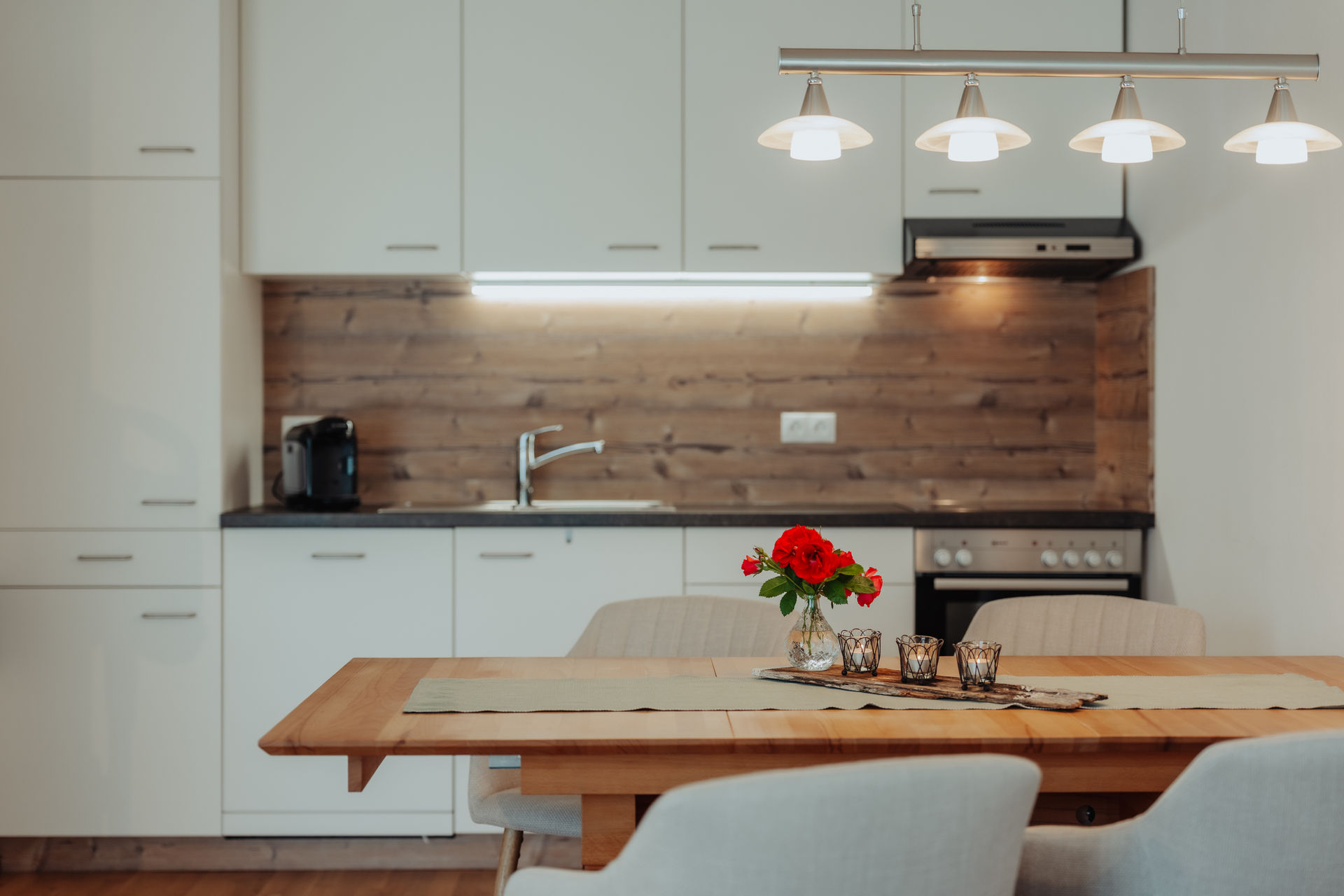 Die gemütliche Wohnküche lädt mit ihrer Essecke und der großen Couch zum Verweilen und Entspannen ein. Hier findest du alles was du benötigst.