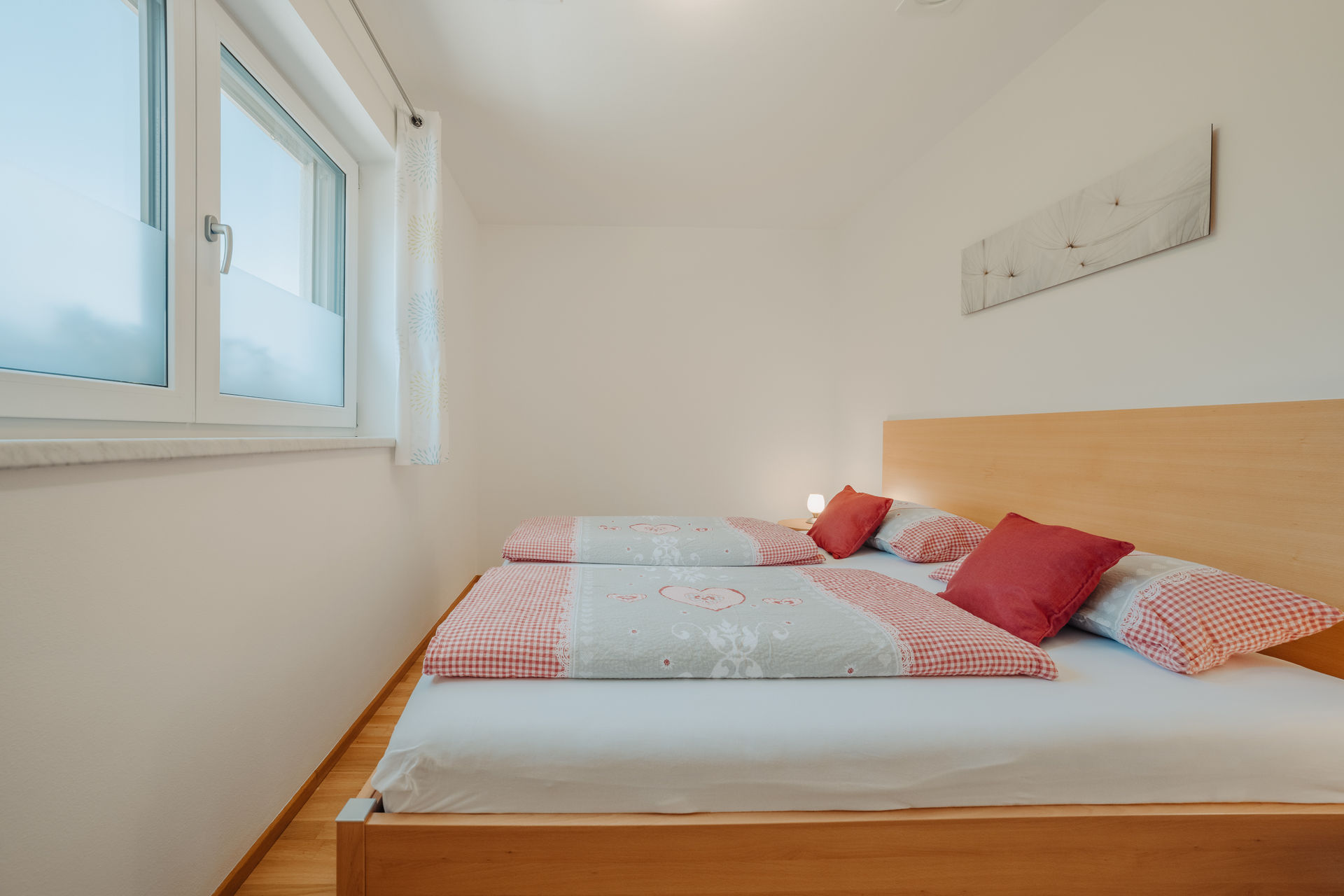 Schlafzimmer 1 – verfügt über ein Doppelbett (180 x 200) mit einem offenen Fußende und Kleiderschrank. Von hier aus bietet sich der direkte Ausblick auf das Bergpanorama.